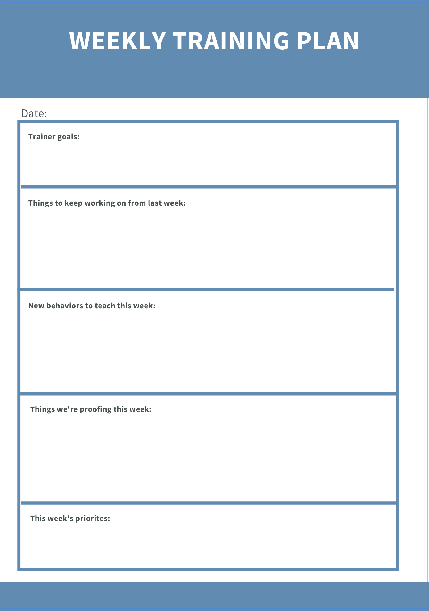 One thing all great trainers have in common is planning and keeping training logs. They have training plans for their behaviors, and they have plans for things like individual sessions, days, and/or weeks.